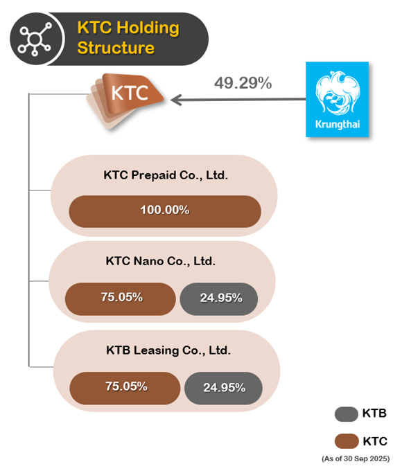 As of the end of 3Q2025, the Group maintained a strong capital structure with well-diversified funding sources, totaling THB 55,655 million in borrowings (including lease liabilities). Long-term borrowings accounted for 70% of total borrowing, while short-term borrowings (including short-term loans and debentures due within one year) represented 30%. KTC’s funding sources remained well-diversified across Thai commercial banks, securities companies, insurance firms, and investment funds. This comprised short-term borrowing from Krungthai Bank and related parties of THB 380 million, short-term borrowing from other financial institutions of THB 5,400 million, long-term loans from Krungthai Bank totaling THB 11,500 million, and debentures of THB 38,094 million. Debentures accounted for approximately 68% of total borrowings, reflecting strong investor confidence and KTC’s solid access to the domestic bond market.