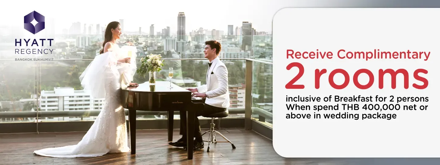 - Receive 2 complimentary Standard Room inclusive of breakfast for 2 persons on the wedding day when spend THB 400,000 net or above in wedding package. (Maximum 3 sales slip)