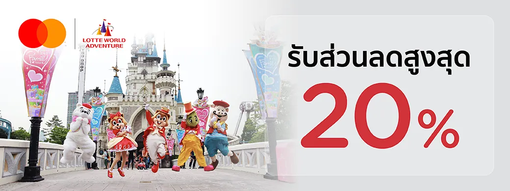 สำหรับบัตรเข้าเที่ยวชม 1 วันที่เคาเตอร์จำหน่ายบัตรเท่านั้น และเลือกชำระเงินด้วยบัตรเครดิต KTC MASTERCARD ทุกประเภทและบัตรกดเงินสด KTC PROUD MASTERCARD ที่ Lotte World โซลและปูซาน ประเทศเกาหลีใต้