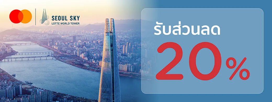 สำหรับบัตรเข้าชมและแจ้งพนักงานหน้าเคาน์เตอร์จำหน่ายบัตรเพื่อใช้โปรโมชั่น และเลือกชำระเงินด้วยบัตรเครดิต KTC MASTERCARD ทุกประเภทและบัตรกดเงินสด KTC PROUD MASTERCARD ที่ Seoul Sky ประเทศเกาหลีใต้