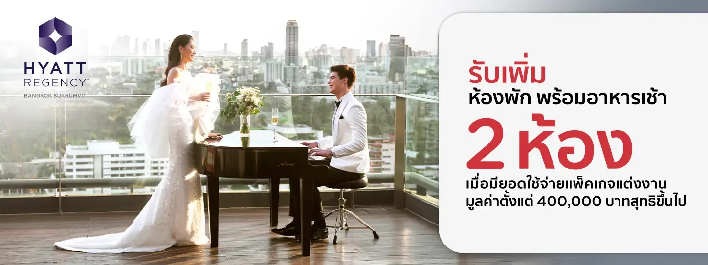 • รับห้องพัก Club Room พร้อมอาหารเช้า สูงสุด 2 ห้อง สำหรับใช้ในวันแต่งงาน เมื่อใช้จ่ายแพ็คเกจแต่งงานมูลค่า 800,000 บาทสุทธิขึ้นไป (ภายใน 3 เซลส์สลิป)