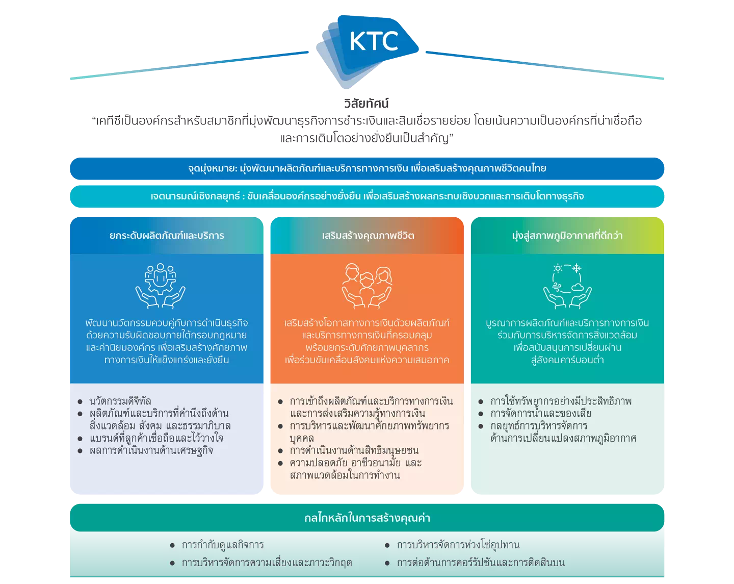 เคทีซีให้ความสำคัญกับความยั่งยืนในทุกมิติของการดำเนินธุรกิจโดยผสานแนวทางความยั่งยืนเข้ากับทุกกระบวนการในห่วงโซ่คุณค่าโดยบริษัทมุ่งมั่นดำเนินกลยุทธ์ที่คำนึงถึงผลประโยชน์ของผู้มีส่วนได้เสียควบคู่ไปกับการยึดมั่นในมาตรฐานความยั่งยืนระดับสากล รวมถึงเป้าหมายการพัฒนาที่ยั่งยืนขององค์การสหประชาชาติ (United Nations Sustainable Development Goals: UN SDGs) ความมุ่งมั่นนี้สะท้อนถึงการให้ความสำคัญต่อการสร้างมูลค่าในระยะยาวรับมือกับประเด็นสำคัญด้านสิ่งแวดล้อม สังคมและธรรมาภิบาล (ESG) พร้อมทั้งผลักดันการเติบโตที่คำนึงถึงความยั่งยืนซึ่งเป็นประโยชน์ต่อผู้มีส่วนได้เสียทุกภาคส่วน